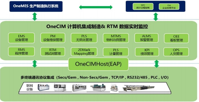 OneCIM实时采集设备数据,通过大数据中心分析数据,进行生产过程智能化管控,实时监控人、机、法、料、环五大因素,提高产品质量,减少人为干涉,降低生产成本。实时跟进设备OEE效率并且实现智能自动排产(APS)、实时派工(RTD),以最低成本实现工厂最大化效益
